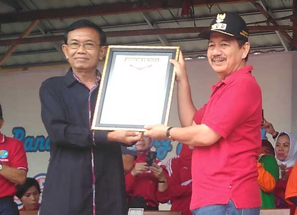 “Pada kesempatan kali ini MURI memberikan piagam penghargaan peserta terbanyak terhadap penggagas pelaksanaan senam tradisional budaya sebagai rekor dalam muatan budaya lokal yang diikuti puluhan ribu peserta,” katanya, saat memberikan penghargaan kepada Walikota Bandarlampung Herman HN, bersama Ketua Tim PKK Kota Bandarlampung Eva Dwiana, di Tugu Adipura, Bundaran Gajah, Bandarlampung, Minggu (1/5/2016).