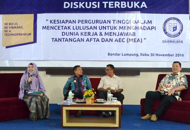 Diskusi Terbuka yang mengusung tema kesiapan perguruan tinggi dalam mencetak lulusan untuk menghadapi dunia kerja dan menjawab tantangan ASEAN Free Trade Area (AFTA) dan ASEAN Economic Community (AEC) diikuti puluhan peserta dari pimpinan perusahaan BUMN/BUMD dan swasta se Lampung, Rektor Darmajaya, wakil rektor I, II, dan III, ketua jurusan, serta para dosen Darmajaya.