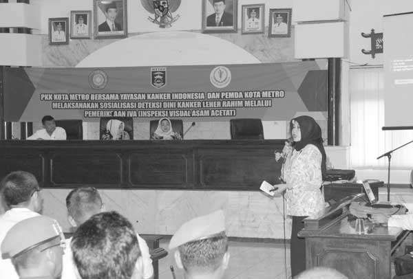 Harianpilar.com, Metro – PKK Kota Metro bersama Yayasan Kanker Indonesia (YKI) dan Pemda Kota Metro melaksanakan Sosialisasi Deteksi Dini Kanker Leher Rahim melalui Pemeriksaan IVA (Inspeksi Visual Asam Acetat) yang berlangsung di Aula Pemda Kota Metro, Rabu (12/04/2017).