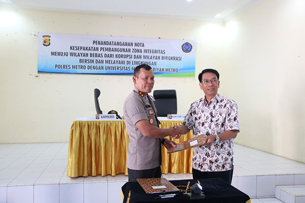 Harianpilar.com, Metro – Guna menuju Wilayah Bebas Korupsi (WBK) dan Wilayah Birokrasi Bersih dan Melayani (WBBM), Kepolisian Resor Metro melakukan penandatangan Memorandum Of Understanding (MoU) dengan Universitas Muhammadiyah (UM) Metro, di aula deviacita Mapolres setempat, Rabu (08/05/2019).
