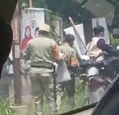 Dalam video itu terdengar suara dua orang wanita yang merekam aksi linmas beratribut satgas Covid-19 di temani tiga orang lainnya menggunakan tiga sepeda motor dengan sengaja melakukan perusakan banner.