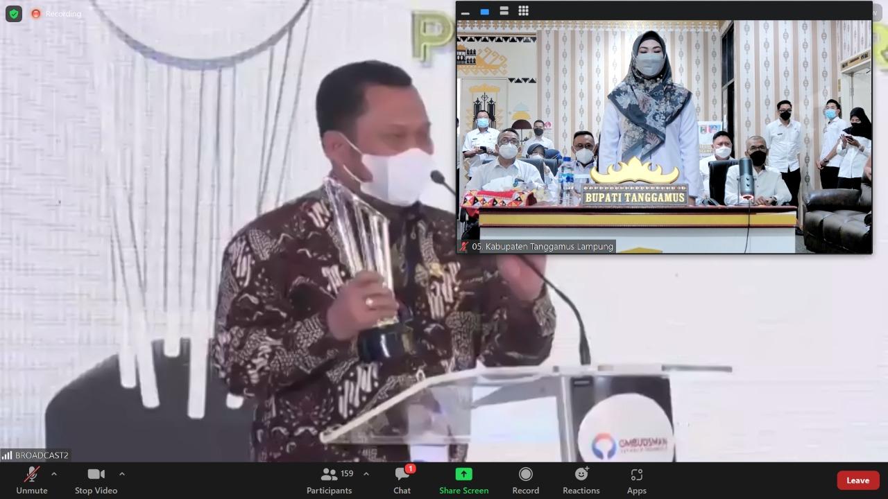 Harianpilar.com, Tanggamus – Jelang tutup tahun, kabupaten Tanggamus masih dianugrahi penghargaan. Bupati Tanggamus Hj. Dewi Handajani mengikuti secara virtual meeting, kegiatan penganugerahan predikat Kepatuhan Standar Pelayanan Publik Tahun 2021 dari Ombudsman RI, dari Ruang Rapat Utama Pemerintah Kabupaten Tanggamus, Rabu (29/12/2021).
