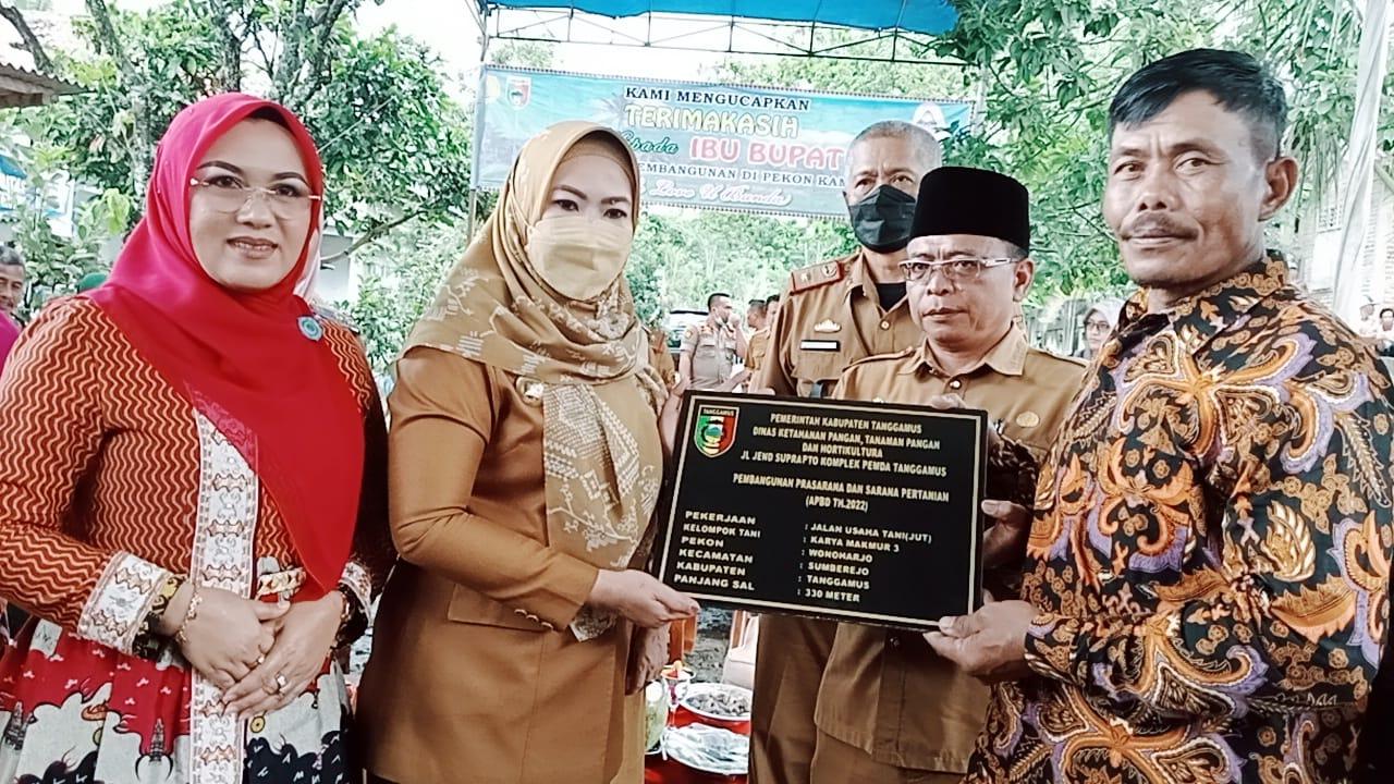 “Pembangunan jalan usaha tani mendongkar perekonomian warga. Jalan tersebut merupakan prasarana transportasi pada kawasan pertanian tanaman pangan, hortikultura, perkebunan rakyat, dan peternakan untuk memperlancar mobilitas alat dan mesin pertanian, pengangkutan sarana produksi menuju lahan pertanian, dan mengangkut hasil produk pertanian dari lahan,” kata Bupati Tanggamus Hj Dewi Handajani, SE saat meresmikan Jalan Usaha Tani di Pekon Wonoharjo, Kecamatan Sumberejo, Selasa (25/10/2022).