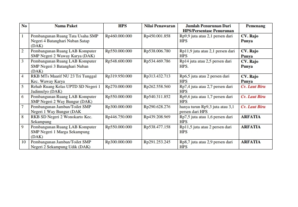 Proyek pembangunan ruang LAB Komputer SMP Negeri 2 Way Bungur (DAK) dengan HPS Rp550 juta tendernya dimenangkan CV. Laut Biru dengan penawaran Rp540.311.852 hanya turun Rp9,6 juta atau 1,7 persen dari HPS.