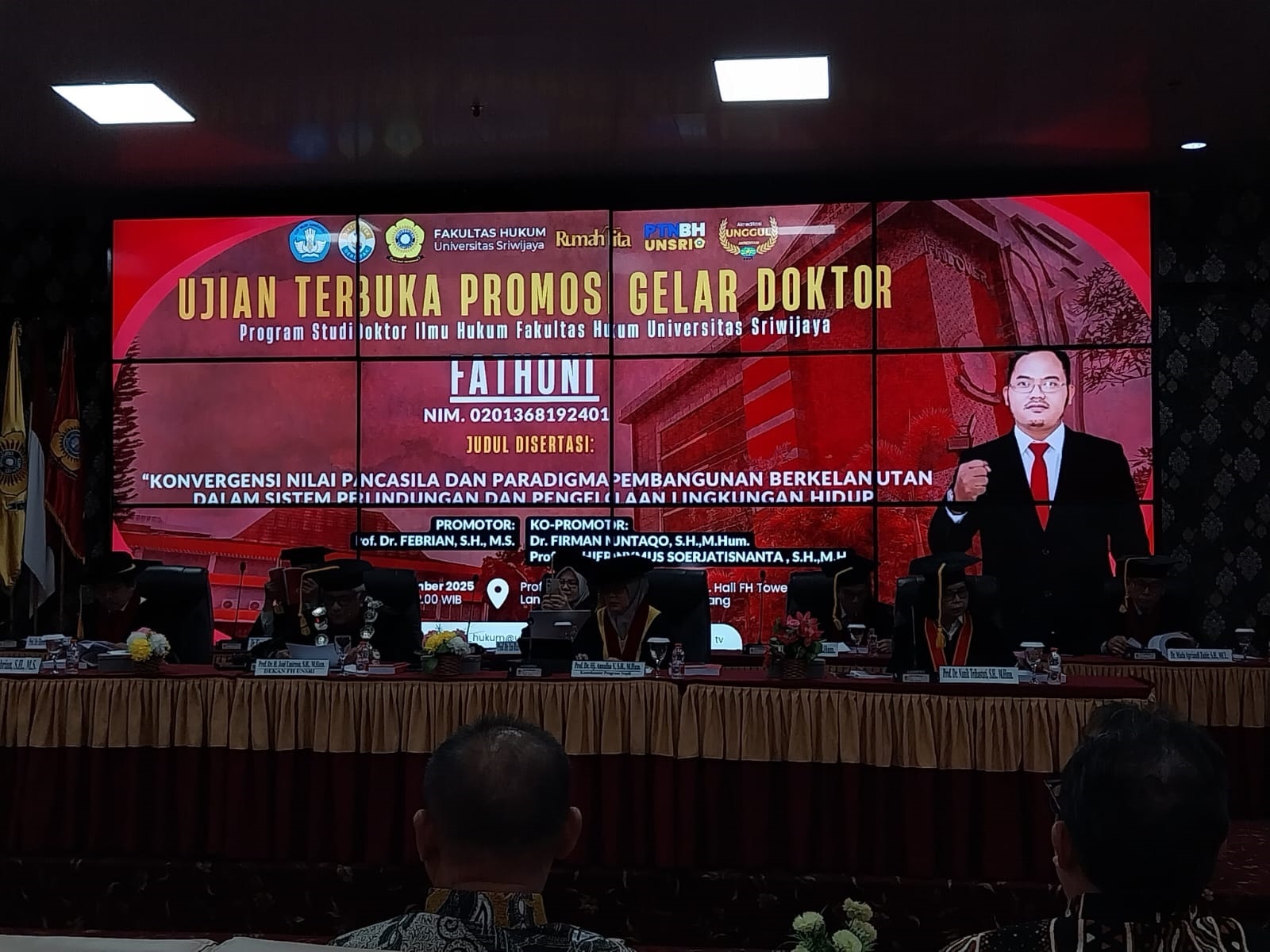 Turut hadir Wakil Rektor I Universitas Lampung, Prof. Dr. Eng. Suripto Dwi Yuwono, S.Si., M.T., serta kolega Fatoni dari berbagai fakultas di Universitas Lampung, menandai capaian akademik yang diharapkan memberi kontribusi strategis bagi pembaruan hukum lingkungan Indonesia. (Ramona)