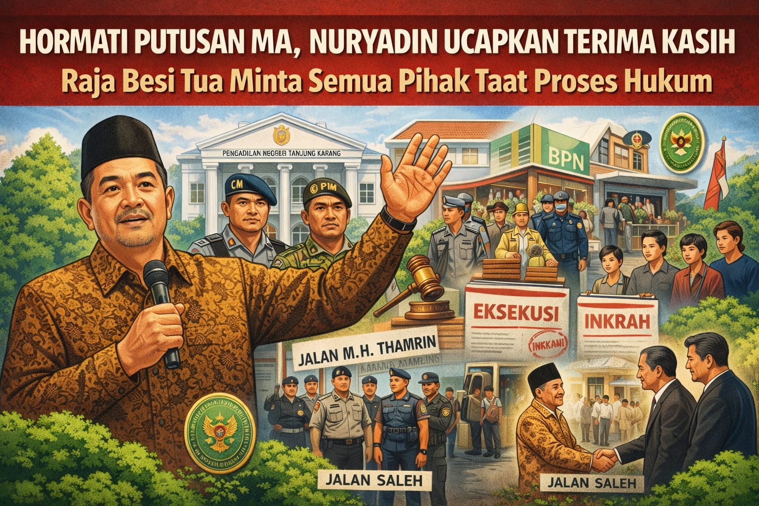 Harianpar.com, Bandarlampung — Haji Nuryadin akhirnya angkat bicara terkait pelaksanaan sita eksekusi berdasarkan putusan Mahkamah Agung (MA) yang telah berkekuatan hukum tetap. Ia menyampaikan apresiasi kepada seluruh pihak yang telah menjalankan proses hukum secara tertib dan kondusif.