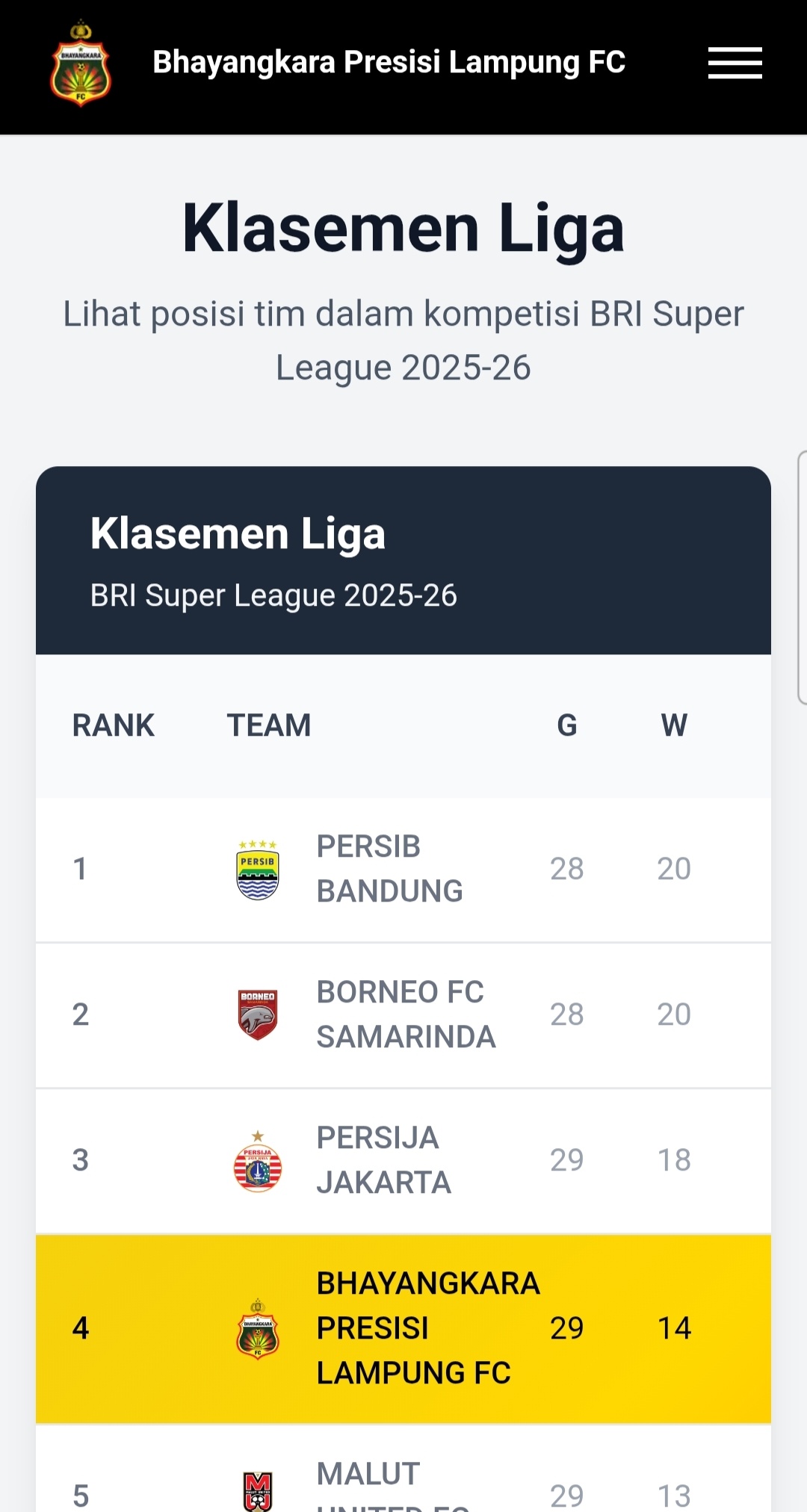 Berdasarkan data klasemen terbaru, Bhayangkara Presisi Lampung FC kini mengoleksi 47 poin dari 29 pertandingan yang telah dijalani.